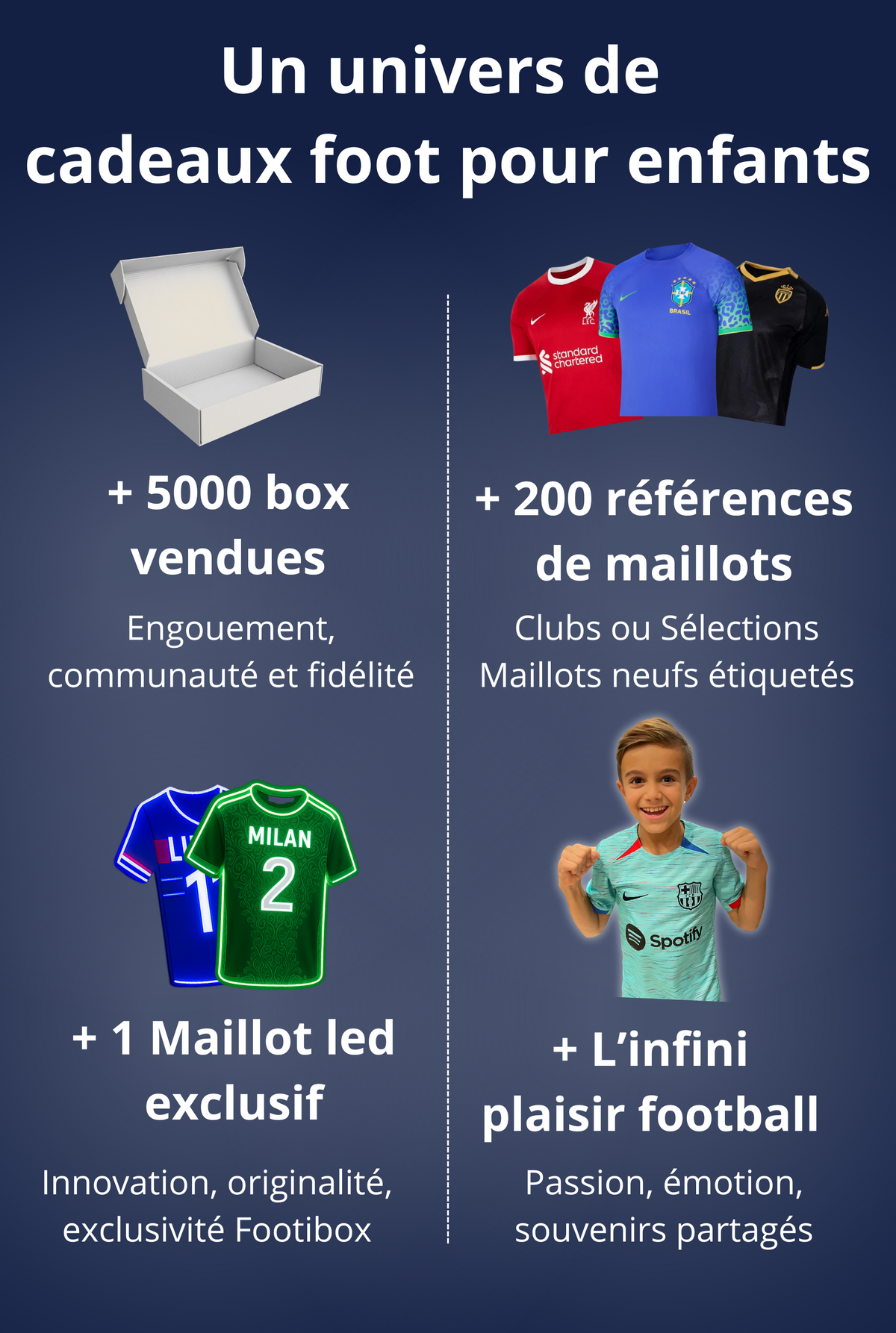 C’est un coffret surprise pensé pour les jeunes fans de foot âgés de 6 à 14 ans ! Un maillot officiel (club ou sélection), un accessoire 100% foot et une carte collector... Le tout livré dans une box qu’on a hâte d’ouvrir. Le but ? Des étoiles dans les yeux à chaque ouverture.
